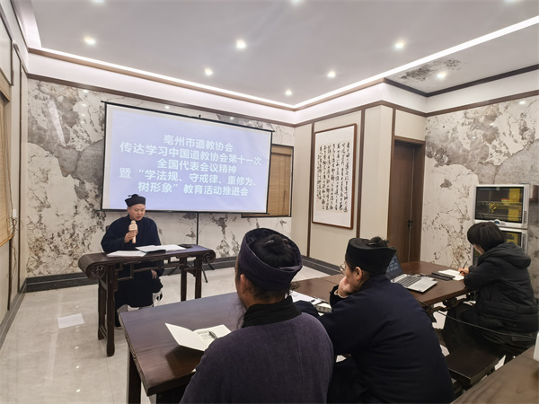 近日,亳州市道教协会在涡阳天静宫召开“学法规,守戒律,重修为,树形象”教育活动推进会,市道协班子成员、天静宫全体教职人员及监事参加会议,市道协会长李诚明道长主持会议。会议传达学习中共中央政治局常委、全国政协主席王沪宁会见中国道教协会新一届领导班子成员的讲话精神,中央统战部副部长、国家宗教事务局局长段毅君讲话精神以及中国道教协会第十一次全国代表会议精神。